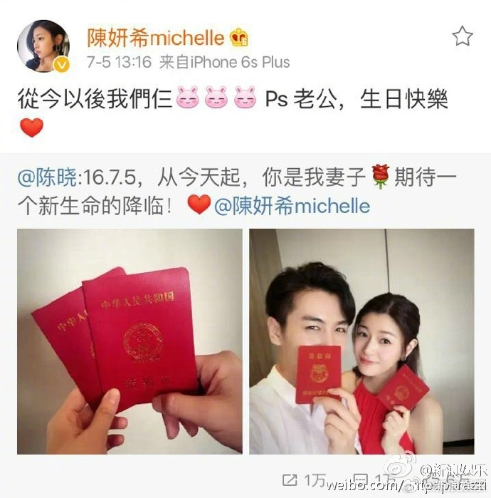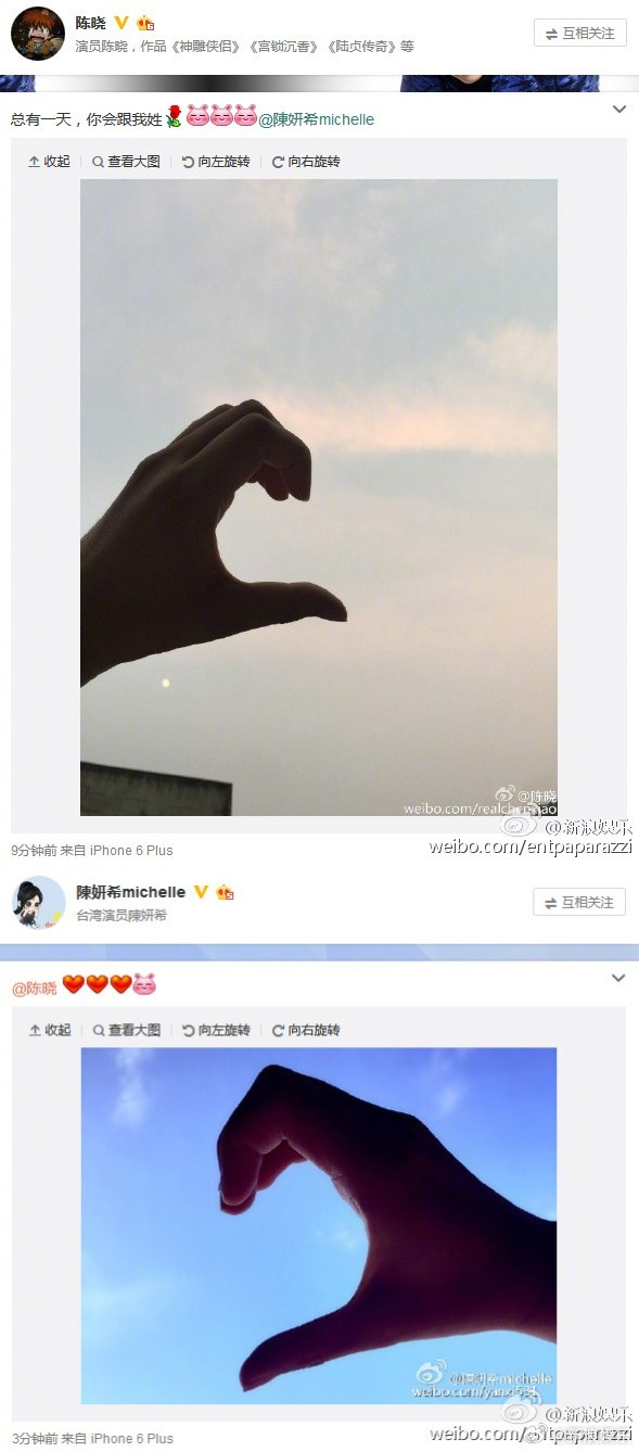 随后,两人分别在微博发了一半心,官宣恋情,陈晓的告白直白热烈:“总有一天,你会跟我姓。”