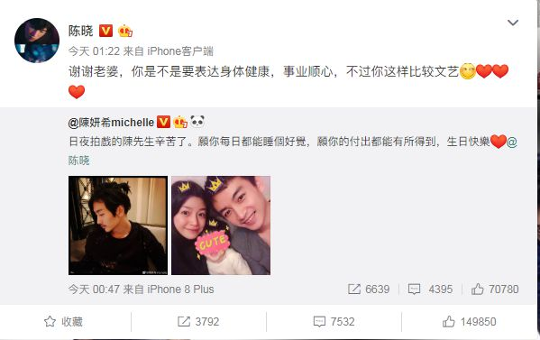 陈晓热烈回应“谢谢老婆”。