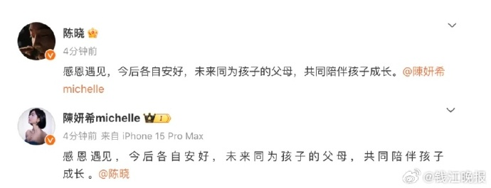 两人发布同样的文字内容:“感恩遇见,今后各自安好,未来同为孩子的父母,共同陪伴孩子成长。”为这段维持九年的婚姻画上了句号。