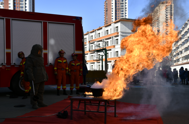在室外操场上,消防员现场搭建液化石油气灶具,通过“油锅起火浇水灭”实验,为师生们讲解此类火灾的预防措施及正确扑救方法。同时,灭火侦检机器人的登场亮相,引得现场人员发出阵阵欢呼。
