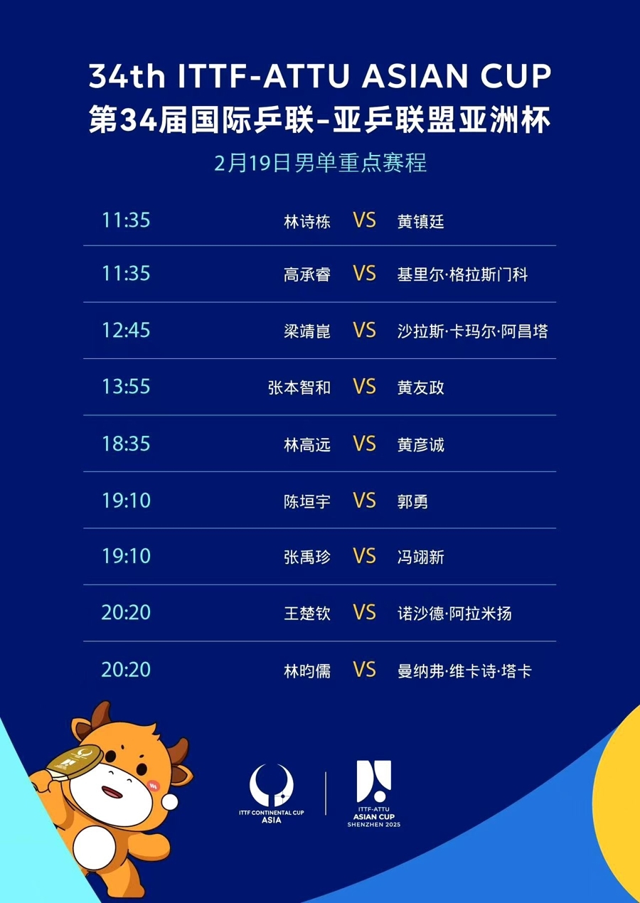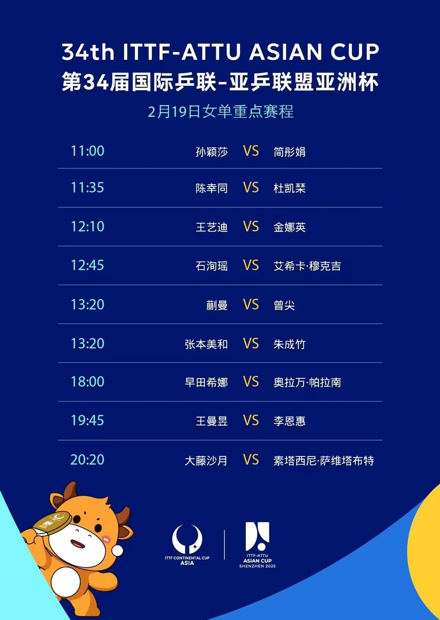 为期五天的亚洲杯乒乓球赛2月18日将在深圳揭开战幕。比赛设置男单和女单两项,各有32名运动员参赛。小组赛签表和赛程于17日出炉,抽签根据同协会避原则分为八组,每组四人进行循环赛,小组前两名晋级十六强;第二阶段为淘汰赛,2月23日产生男女单打冠军。