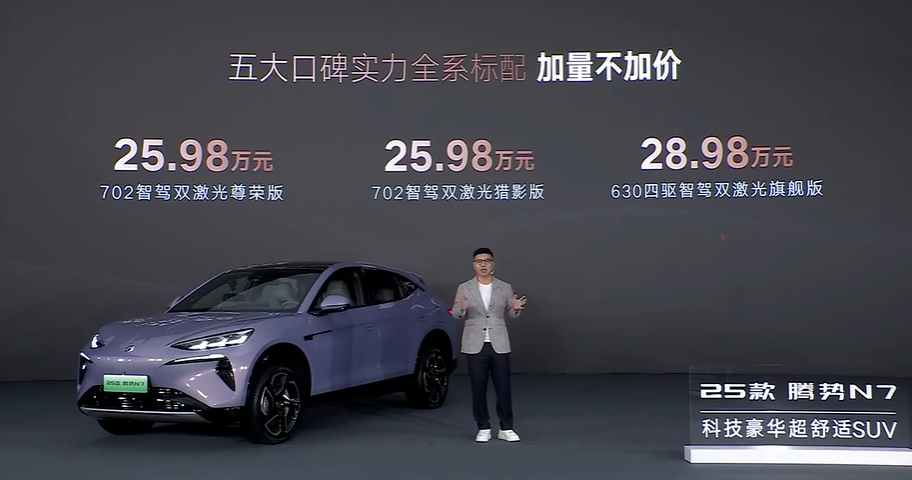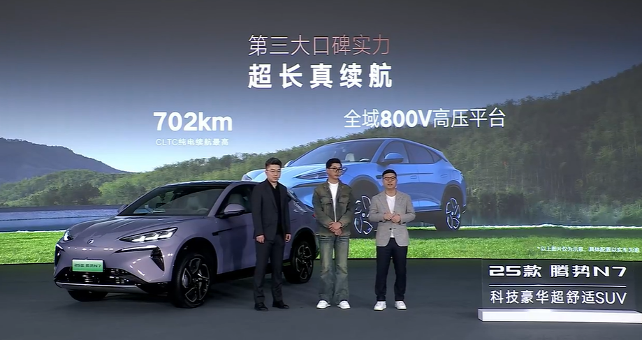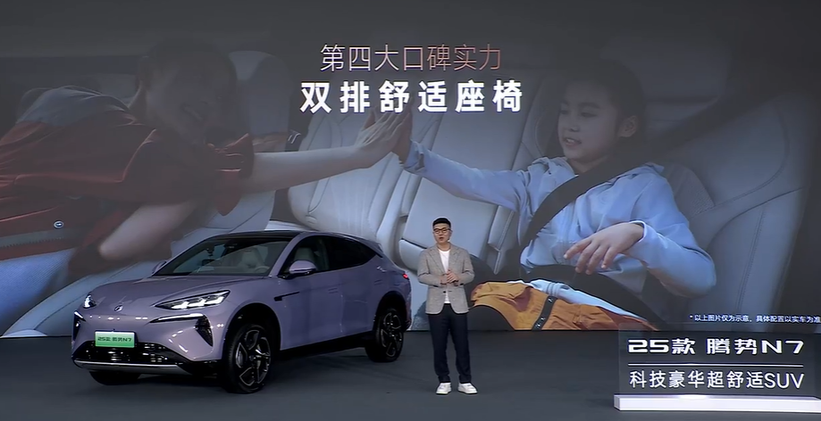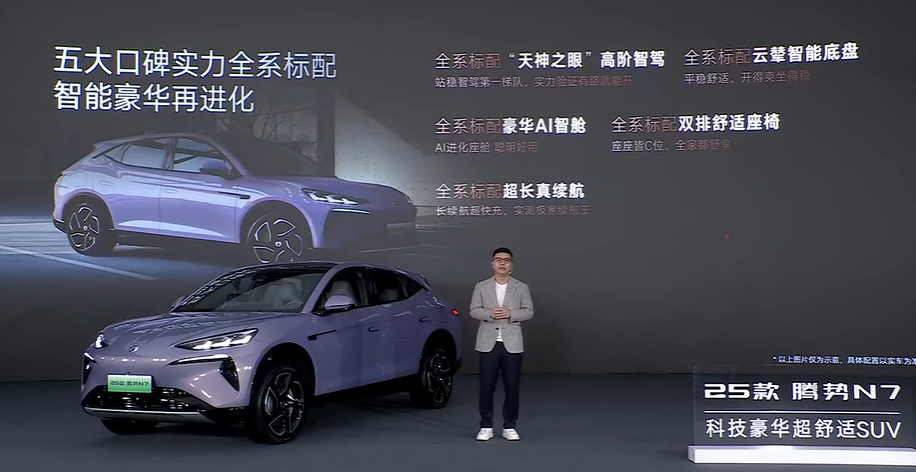 除了好看空间大,新款N7的优点还有很多,例如全系标配高阶智驾、智能底盘、豪华AI座舱、双排舒适座椅、超长续航能力等等配置,腾势官方表示,这是一款“科技豪华超舒适SUV”!