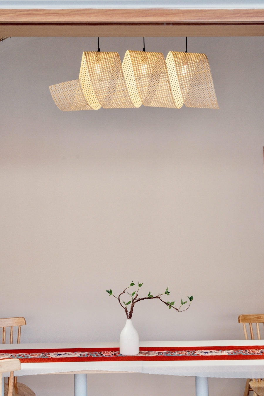 在沪派江南建筑风貌指引的统筹下,小院沿用了上世纪五六十年代当地农居偏爱的红色尖顶,与周边村落保持整体风貌一致。置身稻田中,一抹抹鲜亮的红色,寄予着农民们对生活的朴素热望。屋顶木横梁,保留着原汁原味。周丽娜提示了“彩蛋”——古旧的木横梁与成片竹编巧妙融合,配搭出了意外的“松弛感”。
