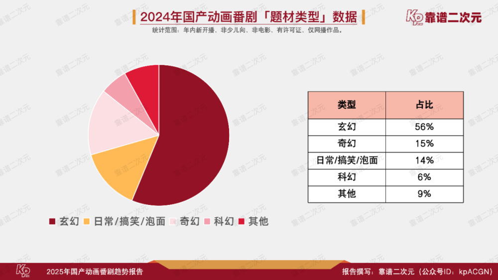 在动画番剧题材方面,玄幻依旧一家独大,56%与2023年基本持平。奇幻成为第二大作品类型,这一点在前两年的趋势中有所提及,主要原因是玄幻求变,更多混搭设定的作品上线,都可归类为奇幻,该类型作品在未来几年仍会持续增加。日常/搞笑/泡面类型作品从2023年的20%降至14%,主要是确实不好看,很多作品既不搞笑、也不日常,或者时长短的面没泡好就结束了,不利于积累观众。科幻类作品比例稳定在7%,国风武侠、运动类作品正在崛起。