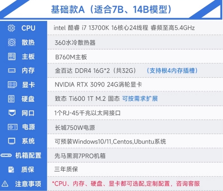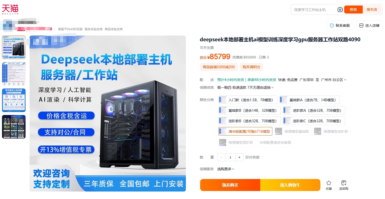那么更贵的型号呢?还是同一家店,一台售价高达12xx9元的DeepSeek PC,配置是i7-13700K+16G*2+RTX 3090 24G,价格暴涨后给的配置确实好了不少,但是RTX 3090仍然是一款“老显卡”,而且考虑到商家标注为“涡轮显卡”,基本上可以确定是在服务器机房里“长期服役”的老将。