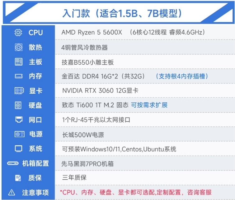 比如淘宝某商家标注的「入门款」DeepSeek PC,配置是AMD Ryzen 5 5600X+DDR4 16G*2+RTX 3060 12G显卡,同时标注可以本地部署1.5B和7B的DeepSeek AI模型。
