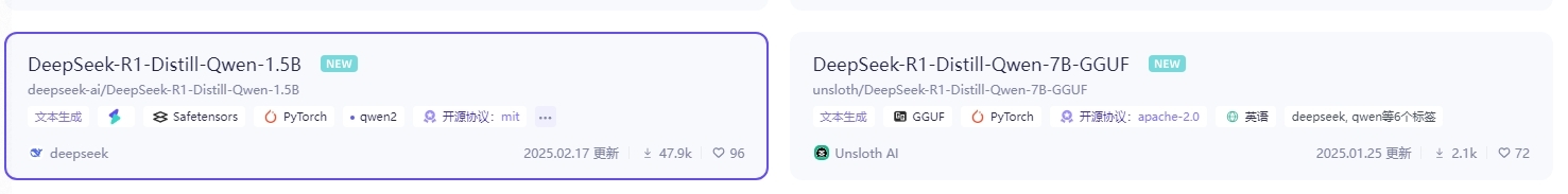 首先来看看商家推荐的1.5B和7B参数模型,这两个模型本质上都不是DeepSeek,而是用DeepSeek的开源技术,在阿里的Qwen AI大模型基础上制作的小参数版本。简单来说,里面的训练数据用的是Qwen,只不过思维链和推理过程与DeepSeek-R1相似,拥有后者的“部分功力”。