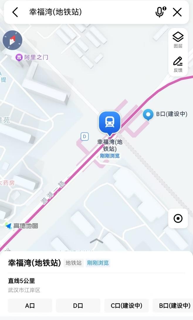 2月18日,记者走访发现,该站是阳逻线幸福湾站,实际上,它位于江岸区游湖一路,靠近幸福湾星苑小区和幸福湾星锦小区,但并不在小区内。目前,该站4个地铁出入口仅开通A、D两个出站口,另外两个出口仍在建设中。