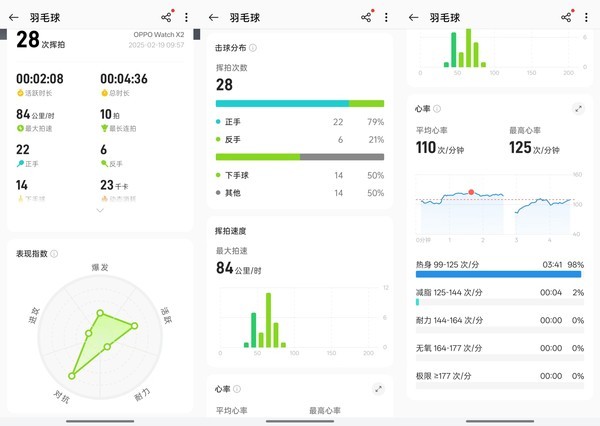 此外,OPPO Watch X2还拥有超百种的运动模式,以及11种深度定制的运动模式。无论是跑步骑行、健身器械,还是游泳滑雪、登山徒步,都能够找到你所需要的。而在这之中,OPPO还独家自研了专业的羽毛球模式,堪称是羽毛球爱好者的福音。