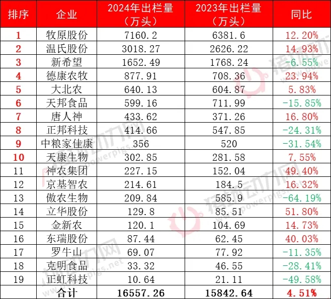 根据最新数据,2024年全年,19家上市猪企共出栏约1.66亿头,较去年同比增长4.51%。其中,新希望生猪出栏量为1652万头,较上年减少近120万头,同比下滑6.55%;牧原股份出栏量为7160万头,同比增长12.2%;温氏股份出栏量为3018万头,同比增长14.93%。