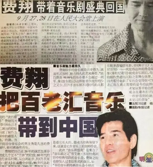 2001年,费翔终于将百老汇音乐剧带回了中国。那年,《非凡之作韦伯爵士世界音乐剧盛典》成功在人民大会堂上演。