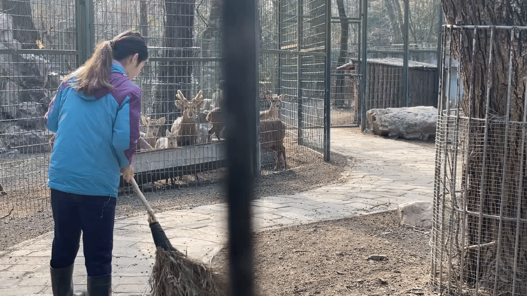 东北马鹿跟我比较投缘,一般来说比较的平静,比如说,外面游客很多的时候,它们就是会自己到室内的场地去,然后自己把门关上,还挺自己自主的。”