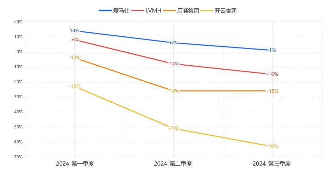 2024年第一、第二、第三季度,爱马仕增速分别为14%、6%、1%;LVMH分别为-6%、-14%、-16%;历峰集团分别为-12%、-18%、-18%;开云集团分别为-19%、-25%、-30%。