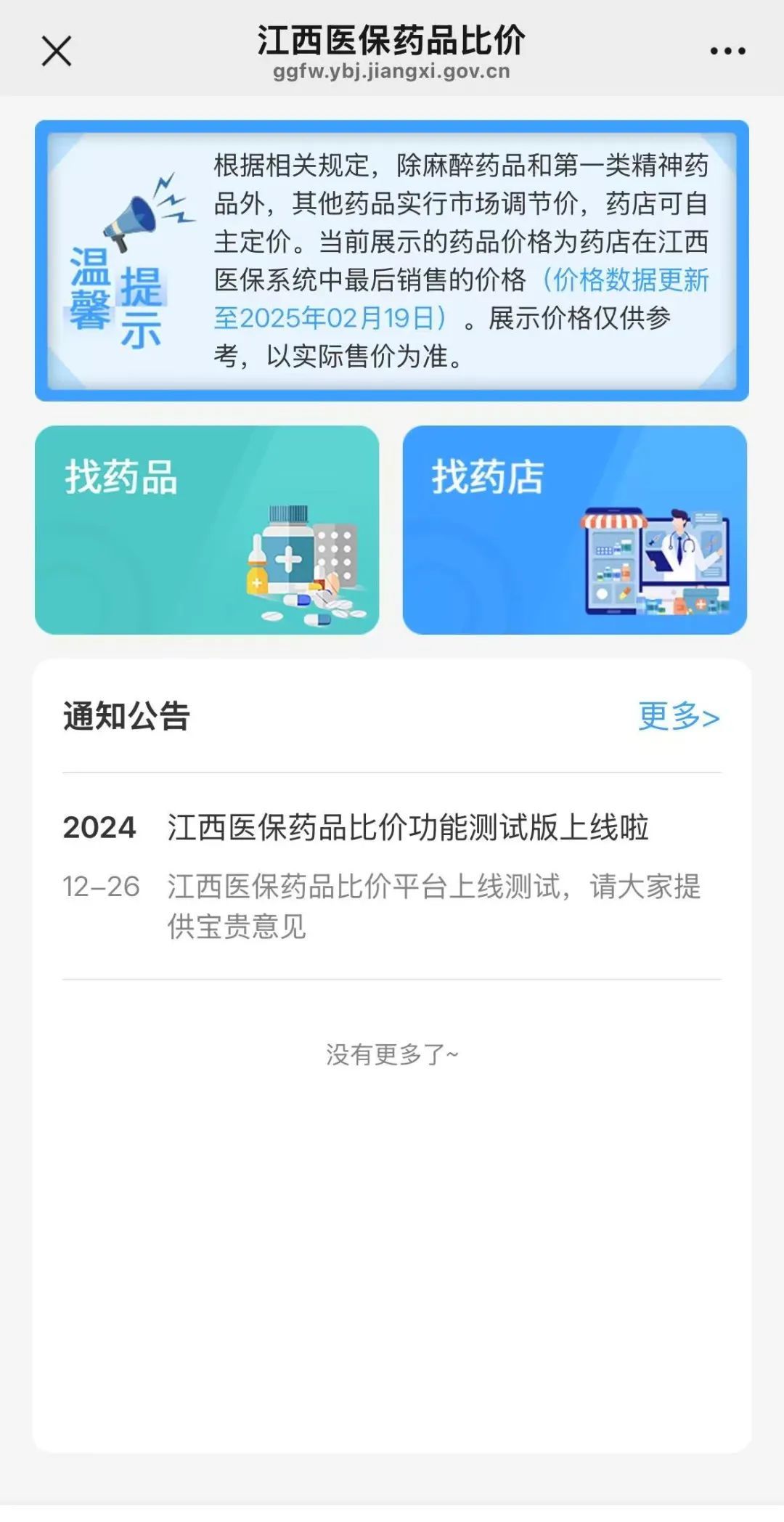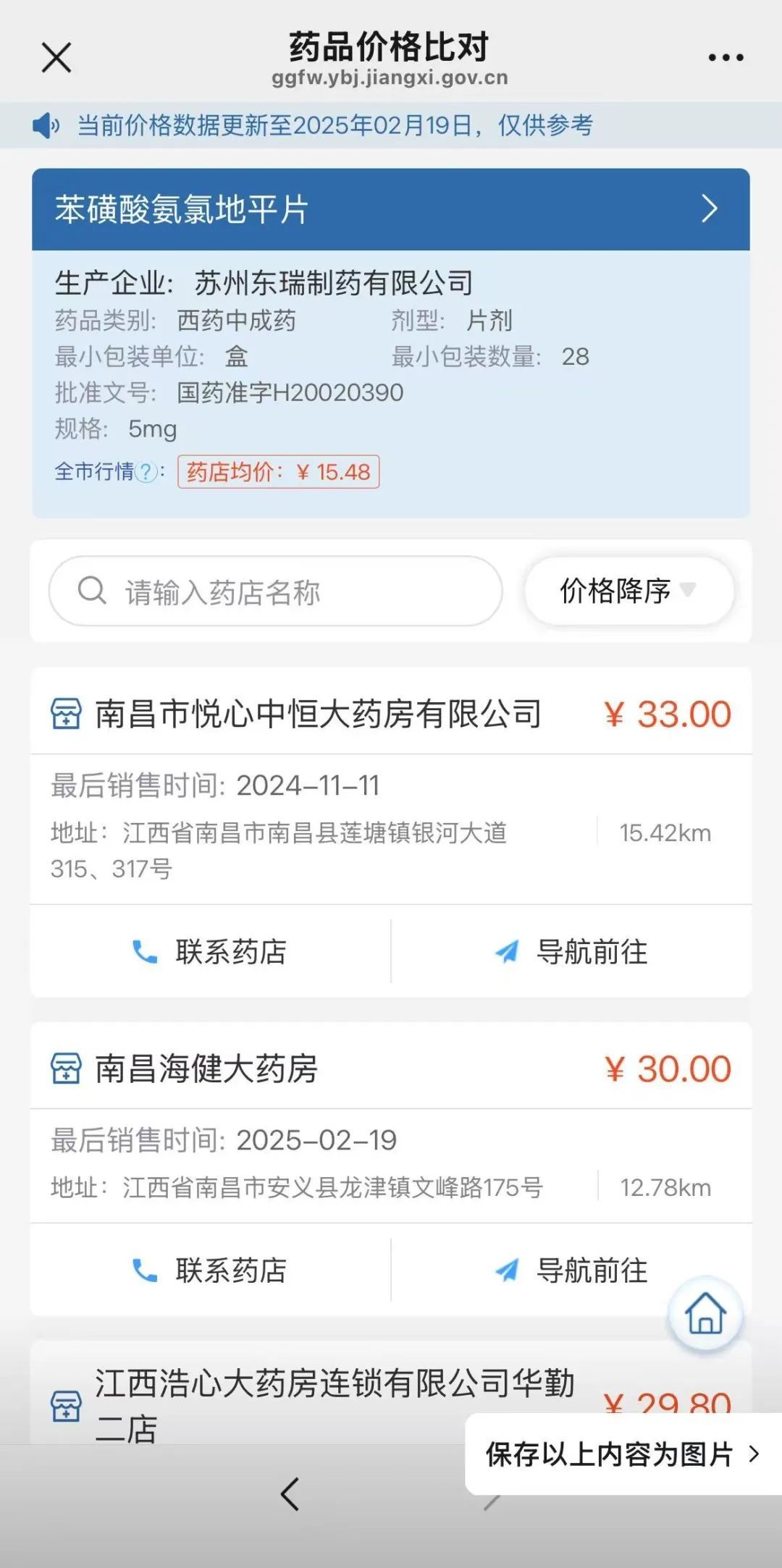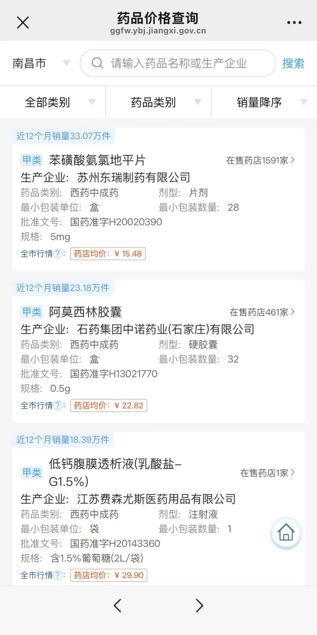 江西省用户可通过“江西医疗保障”微信小程序进入,即点即用。输入药品名称后,点击查看附近在售药店,不仅能看到药品代码、规格剂型、生产企业等群众关注内容,还可以按照距离远近、价格高低进行排序筛选。