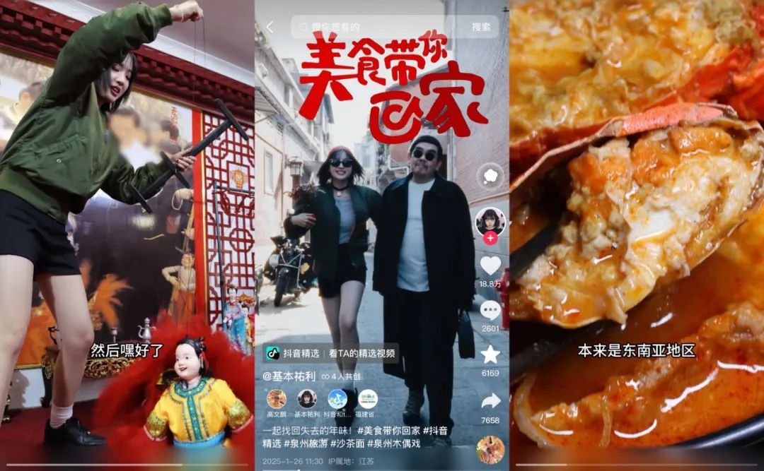 其次,她还利用自身影响力以及账号体验中国风俗民情的定位,与地方文旅合作,促进文化交流。在今年春节期间,@基本祐利 就与@福建省文化和旅游厅、抖音精选等合作,拍摄完成了一期泉州旅游宣传视频。