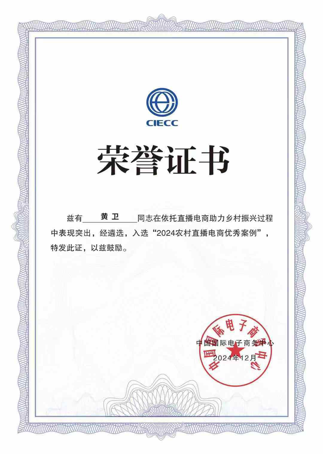 日前,商务部公布2024农村直播电商优秀案例名单,其中,乐昌市乐城街道镇级电商服务站点负责人黄卫荣获“2024全国农村直播电商优秀案例”证书。