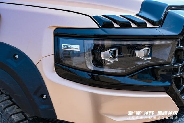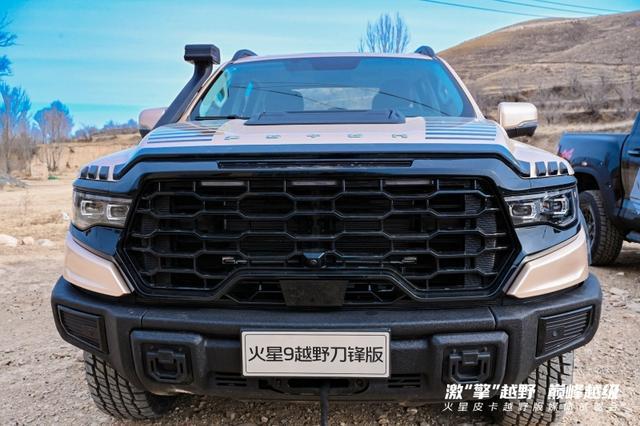 火星9刀锋越野版的外观更加独具特色,前脸采用了全新六边形前格栅中网设计,前杠升级为三段式铁制高强度竞技杠,搭配前引擎盖上3D立体造型出风口装饰件及高位进气涉水喉,展现出强烈的越野气息。两侧标配铁制侧踏,后部换装了铁制高强度竞技杠,车顶具有行李架,车身拥有独特拉花,配合肌肉感十足的越野轮眉、熏黑轮毂、红色卡钳、285AT大轮胎和涉水喉,整车豪放的野性气场在现有国产皮卡车型中难有出其右者。为了增加户外实用性和适用性,火星9刀锋越野版还预留有前绞盘和后拖车钩的加装空间,全部可拓展配置到位后,该车的户外属性会更强。