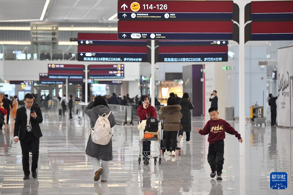 2月20日,乘客走在西安咸阳国际机场T5航站楼出发大厅内,准备值机。