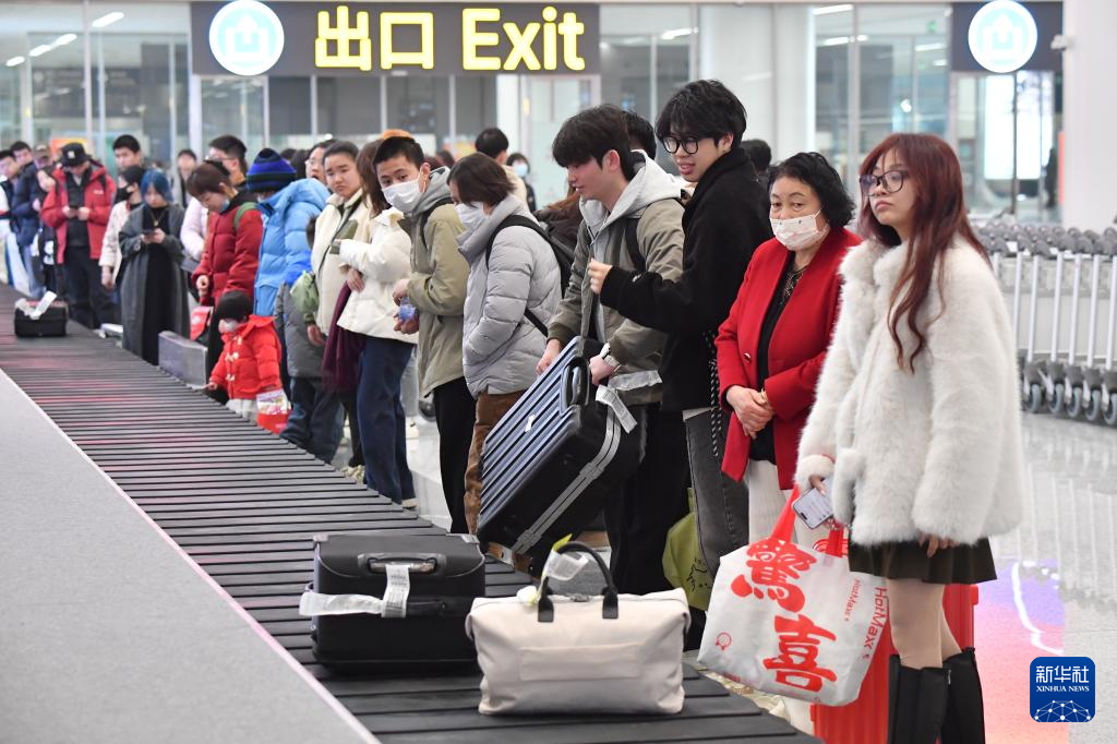 2月20日,乘客在西安咸阳国际机场T5航站楼内提取托运行李。