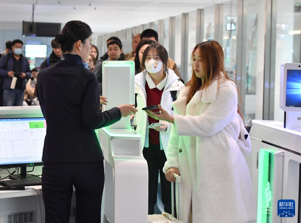 2月20日,乘客在西安咸阳国际机场T5航站楼登机口检票登机。
