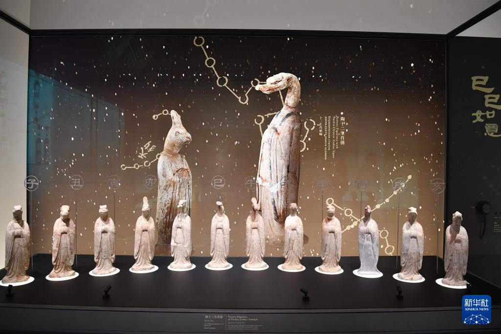 西安咸阳国际机场T5航站楼内的机场博物馆展出的唐代文物陶十二生肖俑(2月20日摄)。