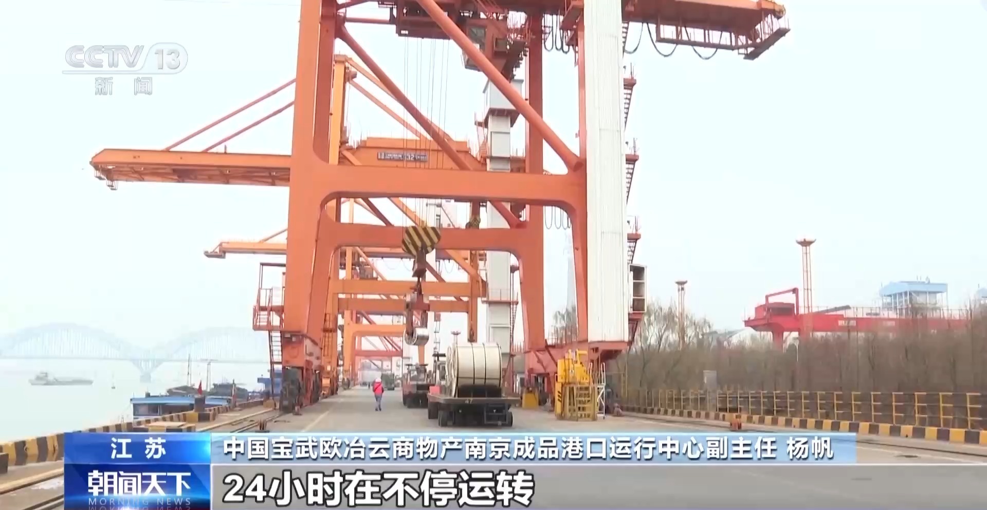 中国宝武欧冶云商物产南京成品港口运行中心副主任 杨帆:24小时在不停运转,节后我们的日吞吐量,几乎比节前翻了两倍,整个下游需求还是比较旺盛的。