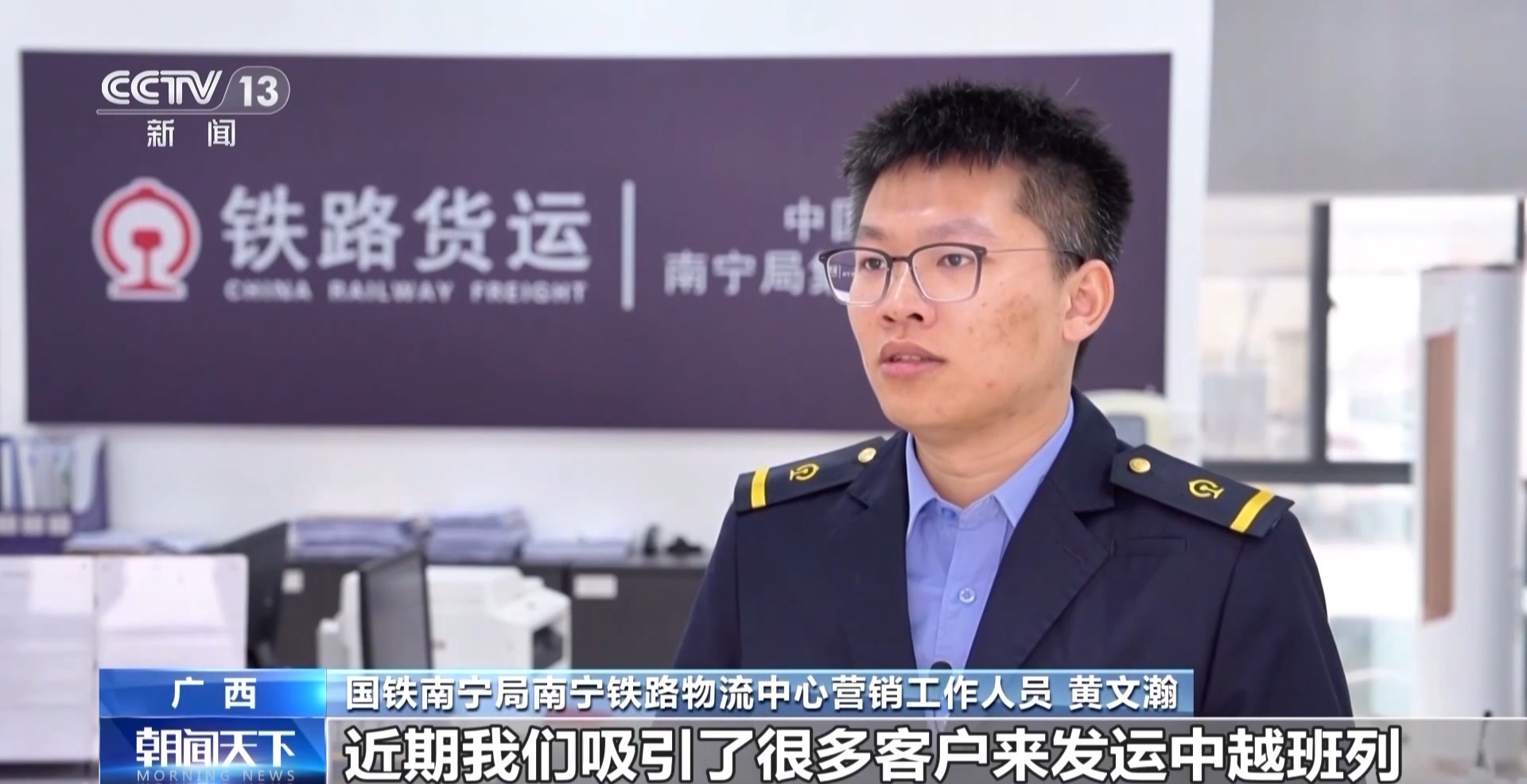 国铁南宁局南宁铁路物流中心营销工作人员 黄文瀚:近期我们吸引了很多客户来发运中越班列,1月份同比增长了760%。新的一年我希望有更多的中越班列客户。