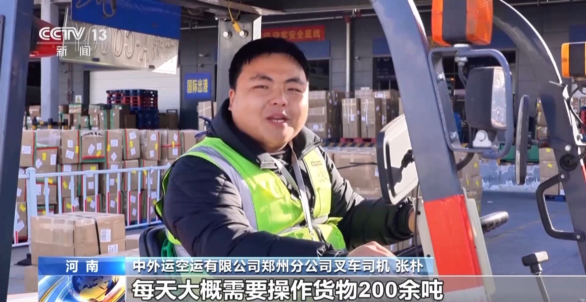 中外运空运有限公司郑州分公司叉车司机 张朴:每天大概需要操作货物200余吨,今年我希望公司的客户多多,大家的奖金也越来越多。