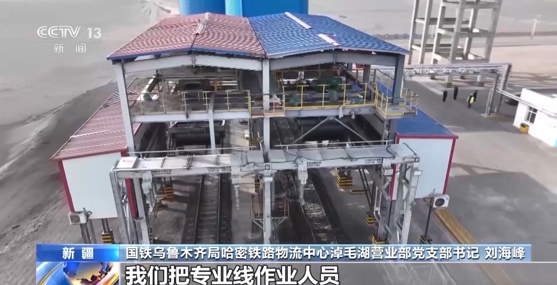 国铁乌鲁木齐局哈密铁路物流中心淖毛湖营业部党支部书记 刘海峰:为了充分发挥环线装车的潜力,我们把专业线作业人员由以前的12人增加到目前的17人,压缩了装车、挂运环节的作业时间。高峰时段每天装车量达到了10到12列。