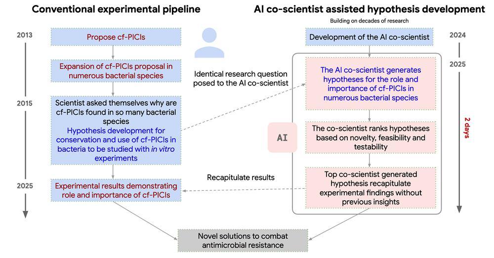 在这一测试中,专家研究人员指导AI协作科学家探索其团队已经发现,但尚未公开的研究主题,即解释为什么噬菌体诱导的染色体岛(cf-PICIs)存在于多种细菌物种中。