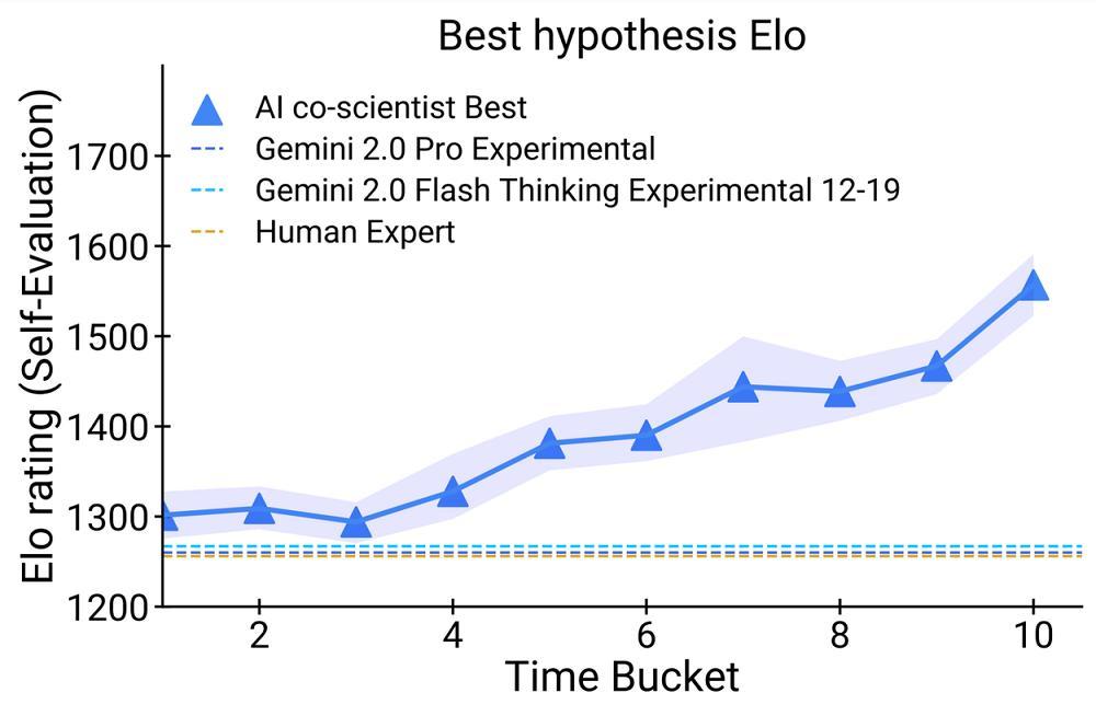 在科研问题上,谷歌让7位人类专家策划15个开放性研究目标,并让人类专家给出最佳的假设解决方案。通过自动化的Elo评估指标,AI协作科学家在解决这些复杂问题时超越了其他最先进的智能体和推理模型。