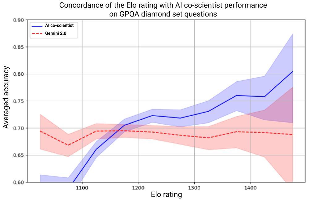 系统的自我提升依赖于从锦标赛中得出的Elo自动评估指标。谷歌团队在GPQA diamond基准测试上验证了,更高的 Elo评级与正确率呈正相关。