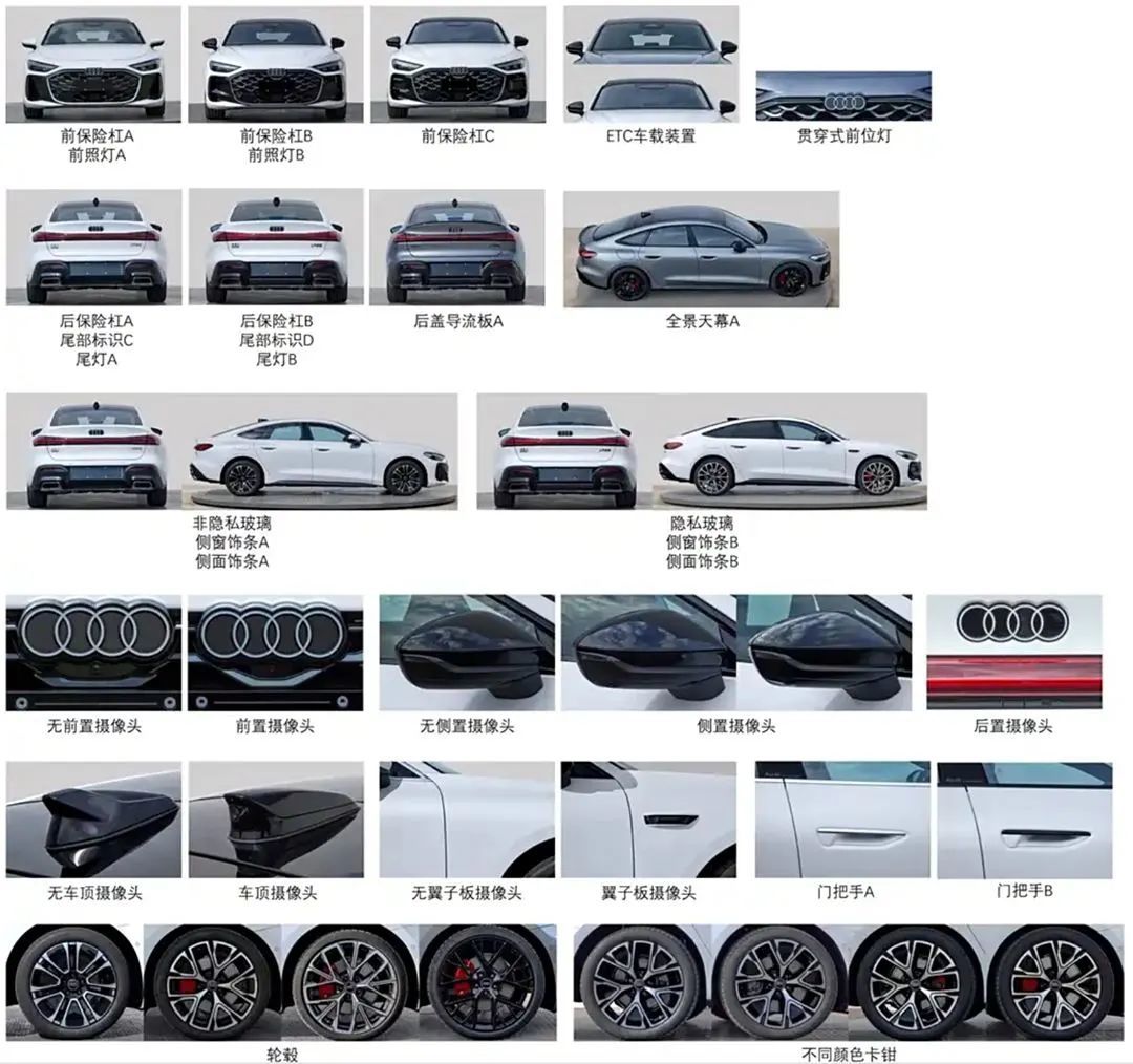 值得一提的是上汽奥迪A5L采用了掀背尾门,这和一汽奥迪那边的三厢设计不同,对照一汽奥迪A5L的正面,会发现尾厢会更加平直。门把手采用半隐藏式,预计也将加入电子化设计,实车未见到激光雷达,但有三目摄像头。新车也根据配置不同,提供了多种轮圈样式,有18、19、20英寸三种轮毂规格。此次上汽奥迪A5L申报了两个版本,有两驱和quattro四驱版本。