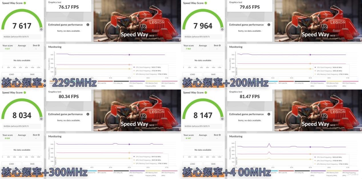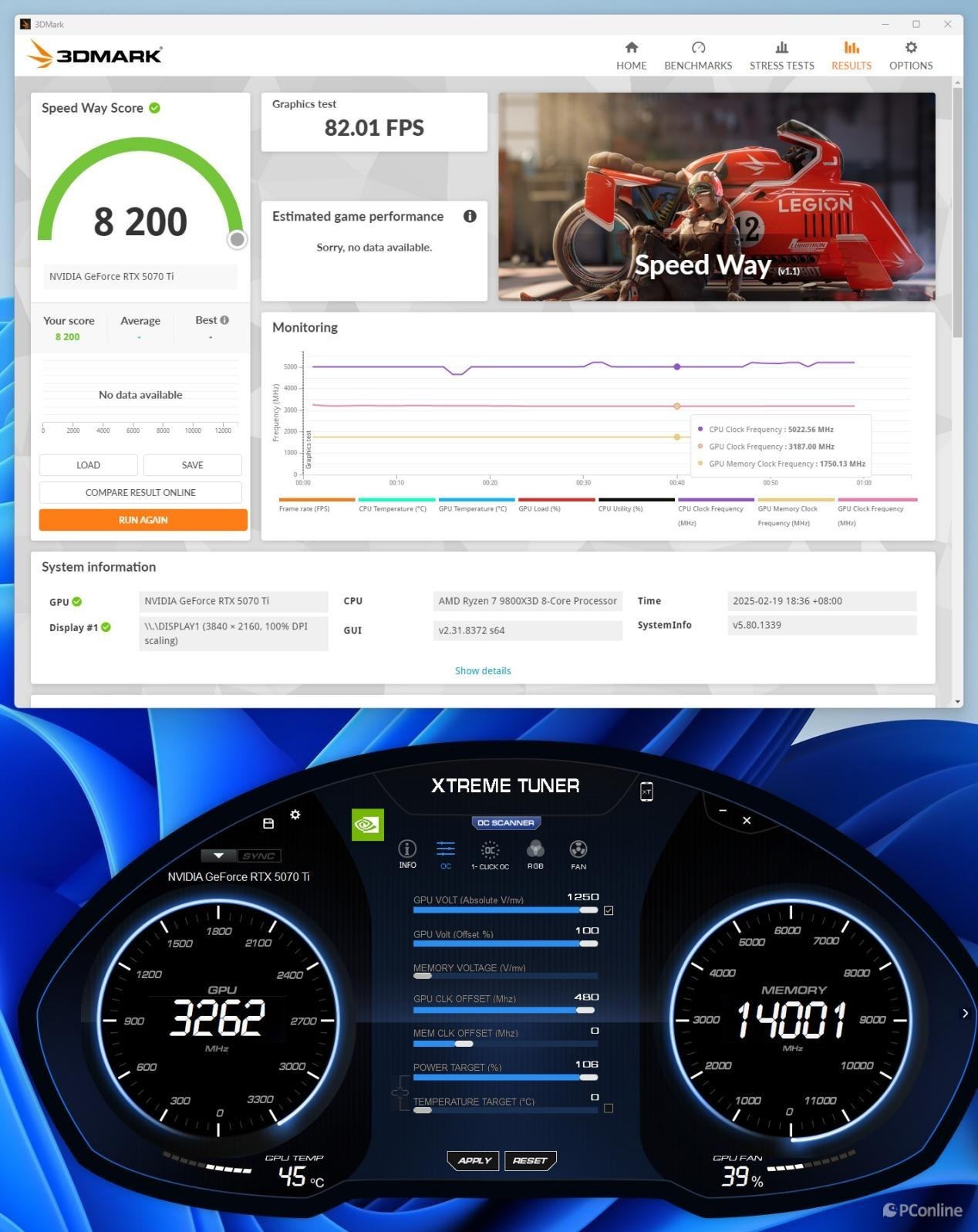 当然这还未算完,最后3DMARK Speed Way得分达到了8200整数,此时核心频率+400MHz,核心频率实际运行在3187MHz,核心频率比未超频前提升了7.8%,相应的Speed Way得分同样是提升了7.7%。当然由于时间限制我们并没有对显存超频,相信核心与显存一起超频后性能表现会更为理想。