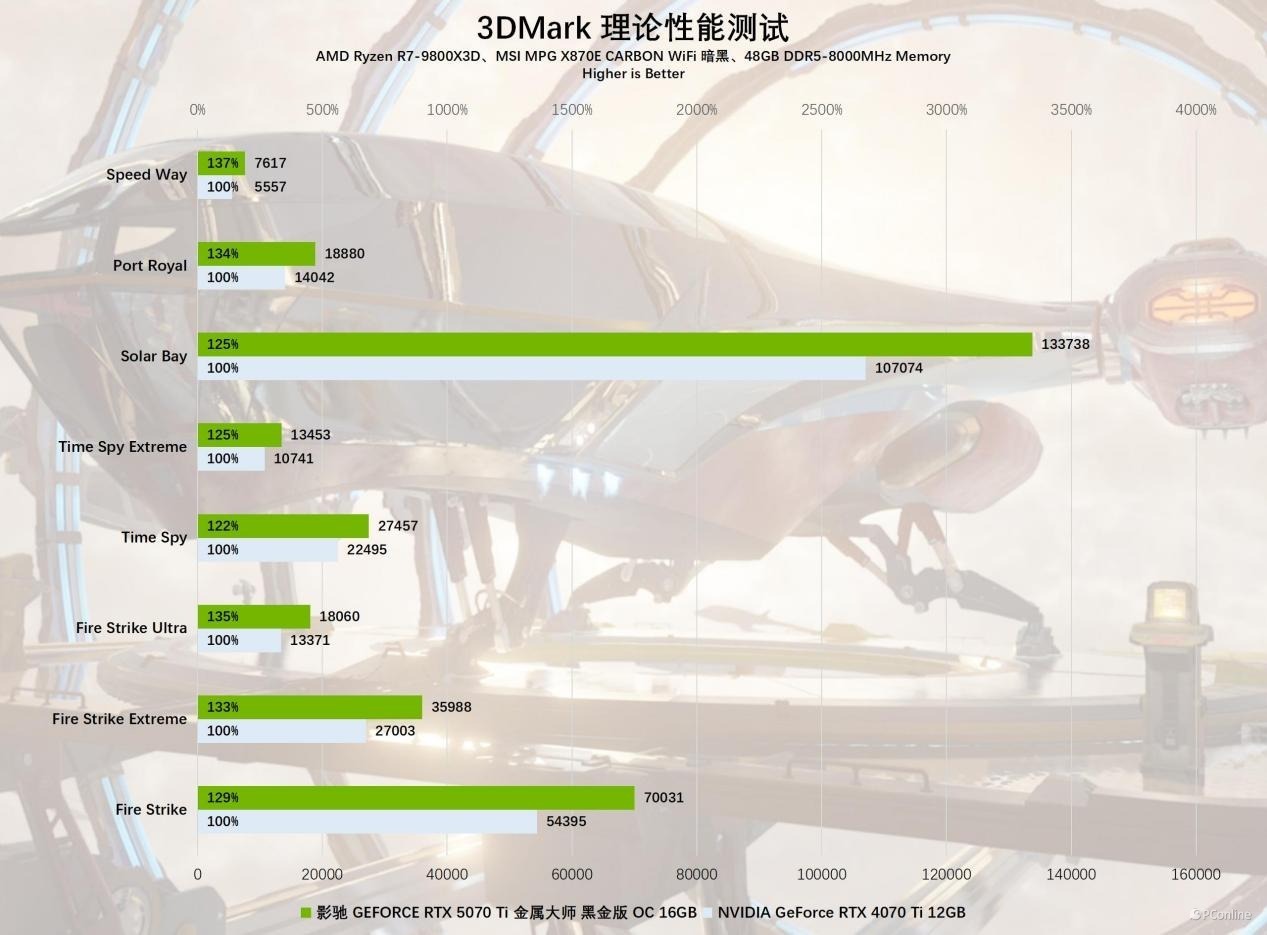 我们首先进行的是3DMARK理论性能测试。在FireStrike系列测试中,影驰RTX 5070 Ti 金属大师OC 16GB有着不错的表现,领先上代RTX 4070 Ti平均约33%的幅度;而DX12的Time Spy系列中,影驰RTX 5070 Ti 金属大师OC 16GB同样有着23.6%的领先幅度。
