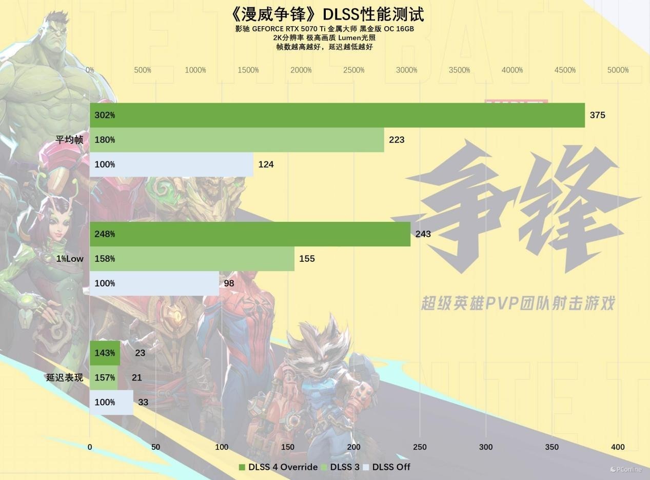 经过实际测试,启用多帧生成功能确实带来了显著的效果。在2K全高设置下,不使用超级采样,《漫威争锋》的帧率可达124 FPS,已经能够提供流畅的游戏体验。当开启DLSS 3技术后,帧率进一步提升至223 FPS,几乎是原生分辨率下的两倍。若进一步启用DLSS 4多帧生成技术,性能提升更是超过三倍,达到375 FPS,这使得游戏体验直接跃升至电竞级别的3A大作。此时,影驰RTX 5070 Ti 金属大师OC 16GB配合2K@360Hz的显示器,游戏体验将更加畅快淋漓。