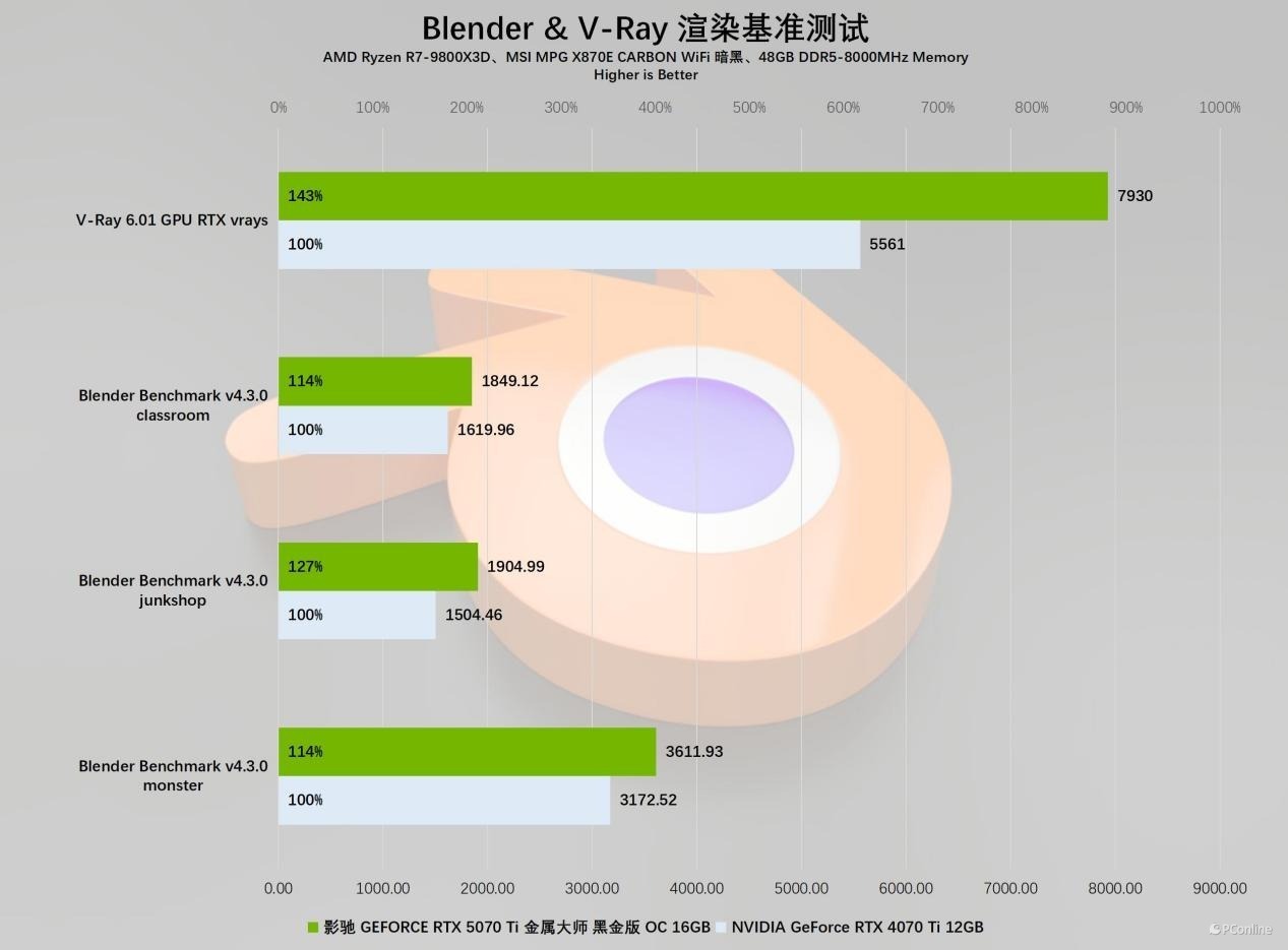 看完了图像视频方面的创作,我们再把目光投向3D渲染以及工业领域的软件中,看看RTX 50系显卡又有怎样的精彩表现。还是熟悉的朋友Blender以及V-Ray,在这两款软件中,影驰RTX 5070 Ti 金属大师OC 16GB的表现也是大杀四方,基本是大幅度领先RTX 4070 Ti。