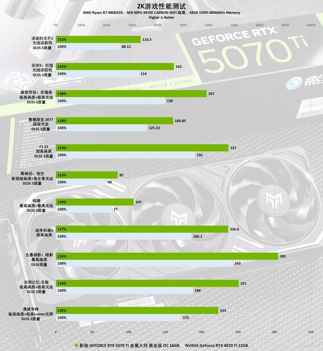 实测2K分辨率下,影驰RTX 5070 Ti 金属大师OC 16GB应对绝大多数游戏都轻轻松松,特别是在DLSS的加持下,满足2K@200Hz电竞级是完全没有问题。即便是全高设置的《黑神话:悟空》面前,这款显卡的游戏流畅度表现也能达到85 FPS的水平。后续《黑神话:悟空》完全能够使用上DLSS 4后,想必帧数提升会更加迅猛。具体到性能上,在11款游戏中,影驰RTX 5070 Ti 金属大师OC 16GB整体比上代RTX 4070 Ti强约31%左右,性能提升足够明显。