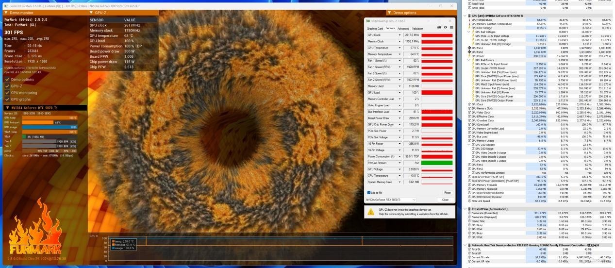 不过实测Furmark烧机10分钟后,得益于影驰RTX 5070 Ti 金属大师OC 16GB 寒光星β散热器的出色设计底蕴,显卡核心温度居然仅为67.9度,显存温度也是64度,此时显卡的最大功率约为300W,已经完全顶着TDP的上限在跑。就是两组风扇转速均达到了1920 RPM左右,当然霜环扇叶风扇的降噪能力还算不错,这转速的情况下,噪声仍在可接受的范围之内,1米外就基本听不见。