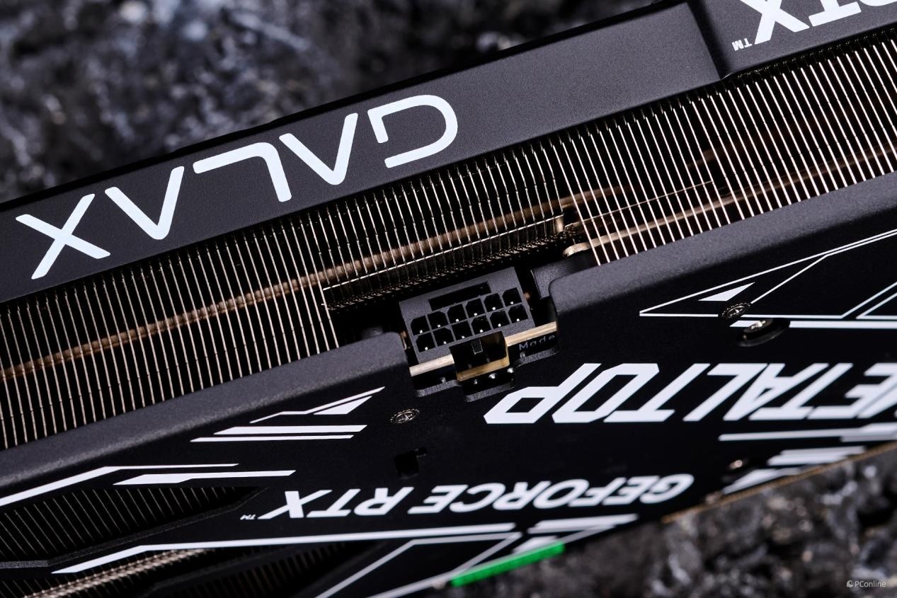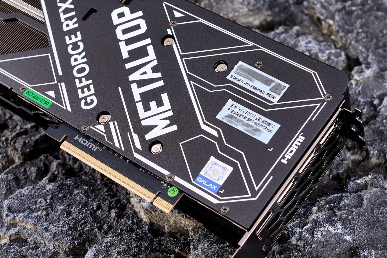 为了打破金属背板的单调感,影驰巧妙地在其上涂装了与显卡正面装饰条相呼应的不规则图案,并印上了醒目的“METALTOP”金属大师LOGO,从而进一步提升了显卡的整体质感和视觉吸引力。