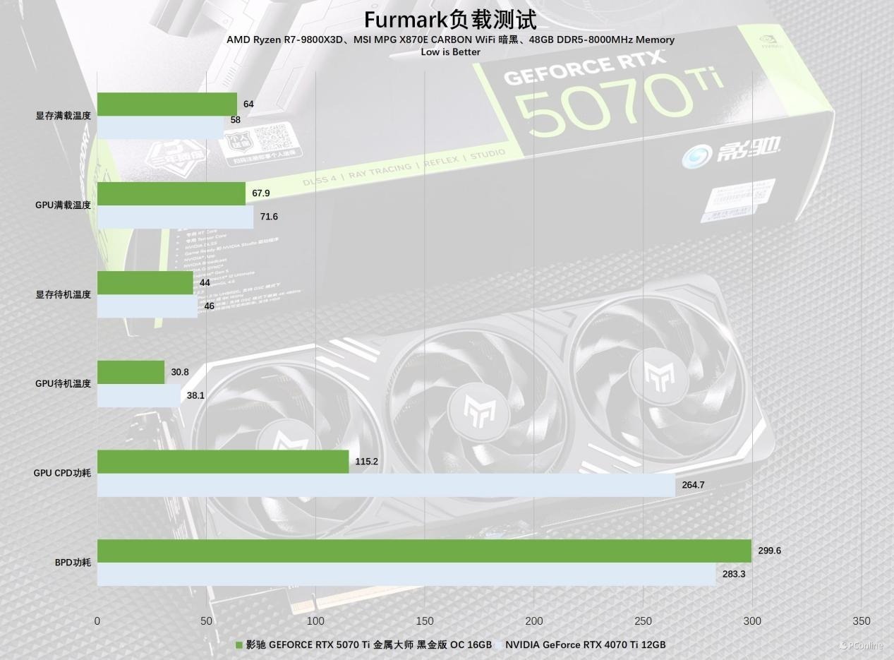 在与RTX 4070 Ti进行对比时,尽管影驰RTX 5070 Ti 金属大师OC 16GB的热设计功耗(TDP)有所提升,但其烤机时的整体功耗仍然维持在较低的水平。此外,这款双槽显卡在减薄的同时,依然能够有效地控制核心与显存的温度,这确实令人感到惊喜。对于ITX平台的玩家而言,这无疑是一个好消息,意味着即便是小型主机也能享受到强大的性能。