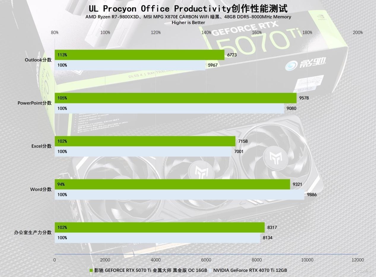 在办公软件的测试环节中,影驰RTX 5070 Ti 金属大师OC 16GB的表现相当稳定,其整体性能大约领先3%。这一优势主要体现在Excel、PowerPoint以及Outlook这三个应用程序上。实际上,使用这种级别的显卡,用户通常不会过分关注其在办公软件中的运行速度,因为日常办公软件的应用负载相对较轻。