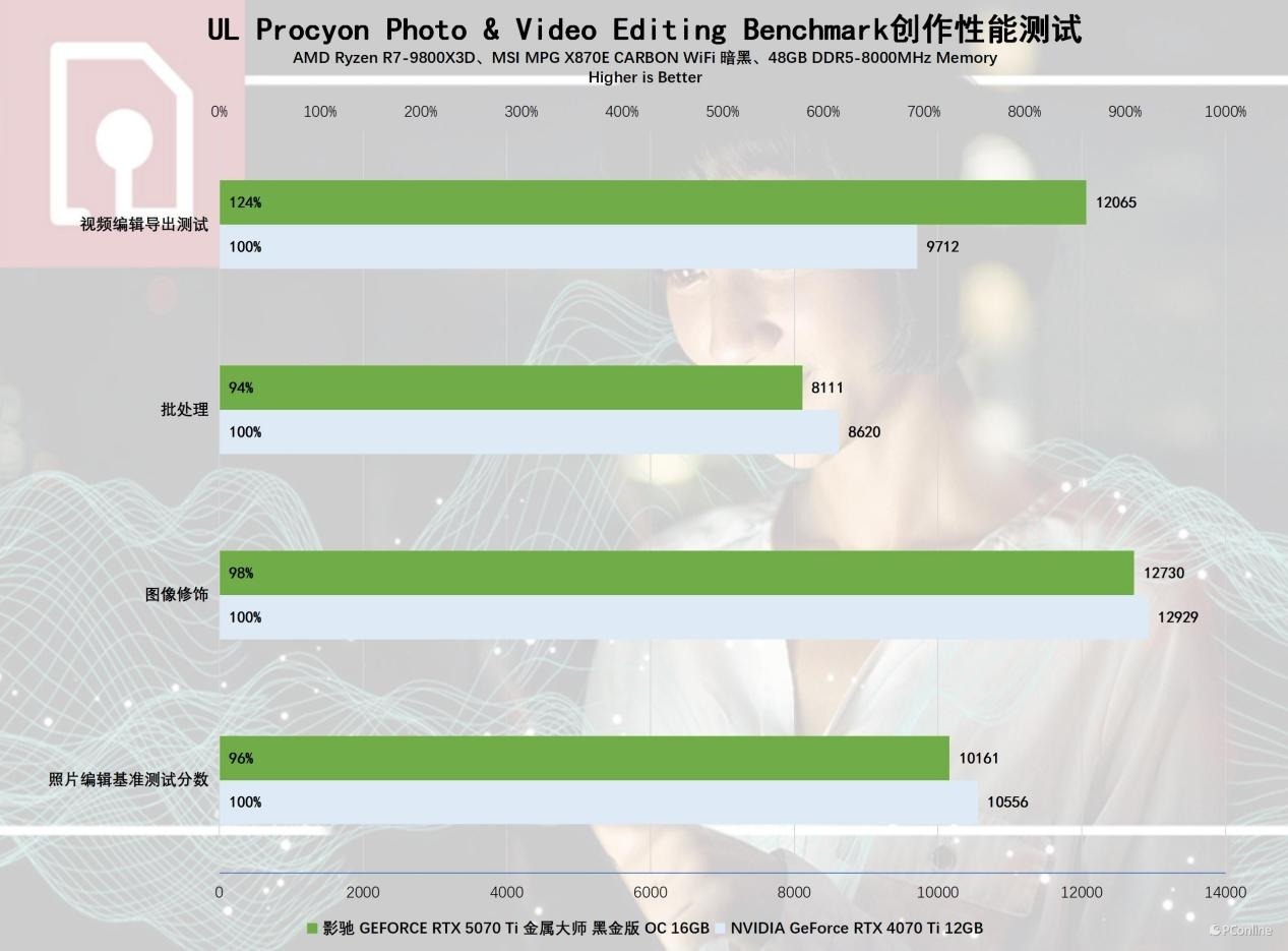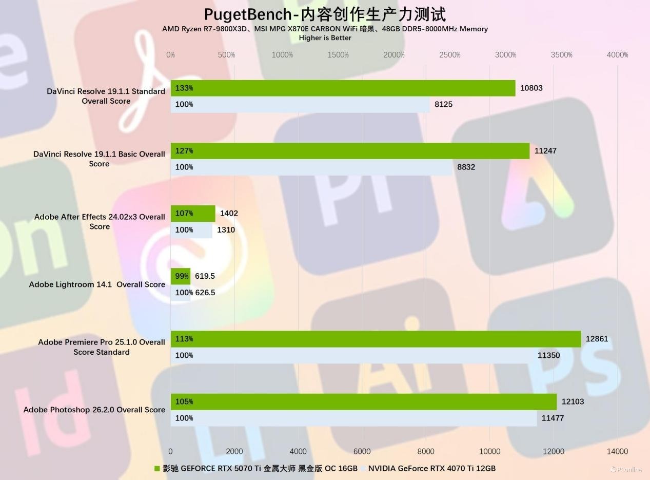 在平面设计与视频测试中,我们测试了UL Procyon与PugetBench两个不同的组件,得到的结果基本是相同的。影驰RTX 5070 Ti 金属大师OC 16GB在视频基准测试中的性能表现的惊人的,这得益于新一代GeForce RTX 5070 Ti对编码器的进一步升级,它不仅提高了编解码的效率,还扩展了支持的格式范围。因此在达芬奇和Premiere Pro的测试中,影驰RTX 5070 Ti 金属大师OC 16GB相较于RTX 4070 Ti领先约13%~33%,这一差距相当显著。