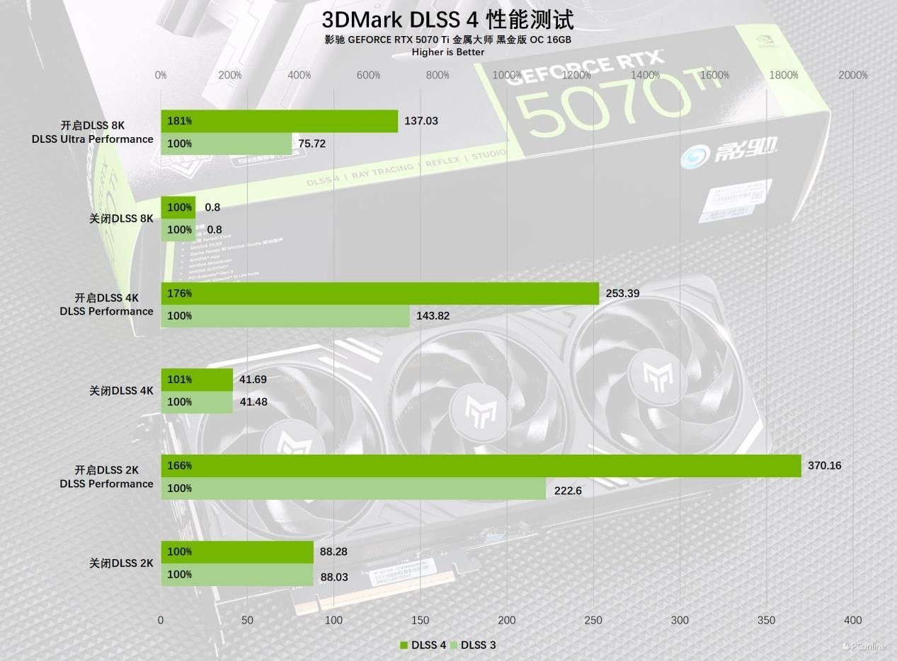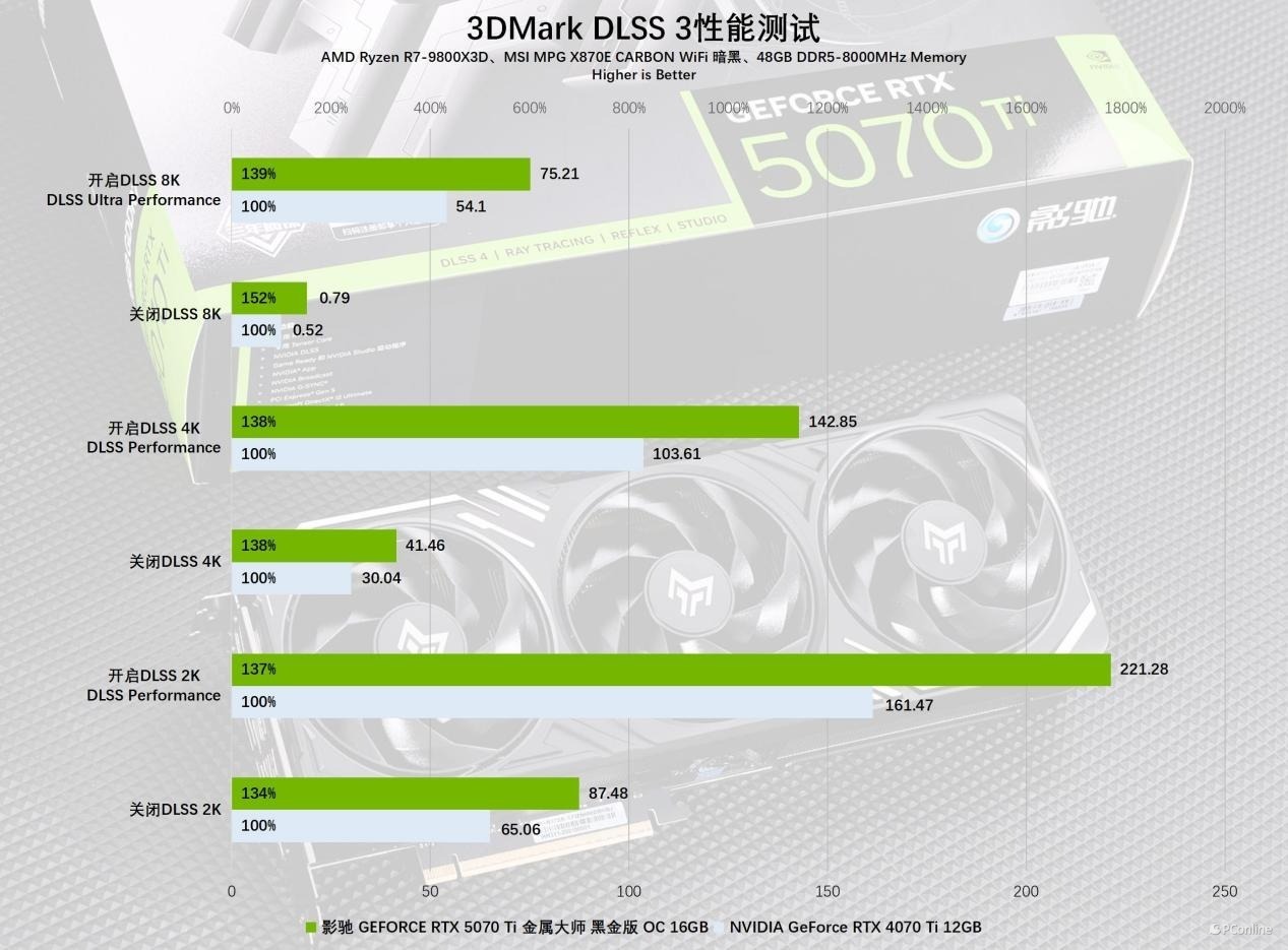 随后是3DMARK DLSS测试中(DLSS3性能测试),影驰RTX 5070 Ti 金属大师OC 16GB的表现同样抢眼。在DLSS 3技术加持下,其延续了刚才的性能提升幅度,部分项目甚至超过了40%,展现出了强大的AI加速能力。这意味着在支持DLSS 3的游戏中,玩家将能够享受到更加流畅、细腻的游戏画面,同时获得更高的帧率表现。