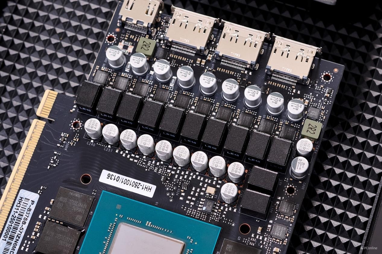 由于显卡空间有限,影驰RTX 5070 Ti 金属大师OC 16GB的PCB板也采用了小巧紧凑的设计方案。它采用了12层非公版PCB设计,配上10+4+3相供电,同时搭载了RTX 5070 Ti核心和16GB GDDR7显存颗粒。