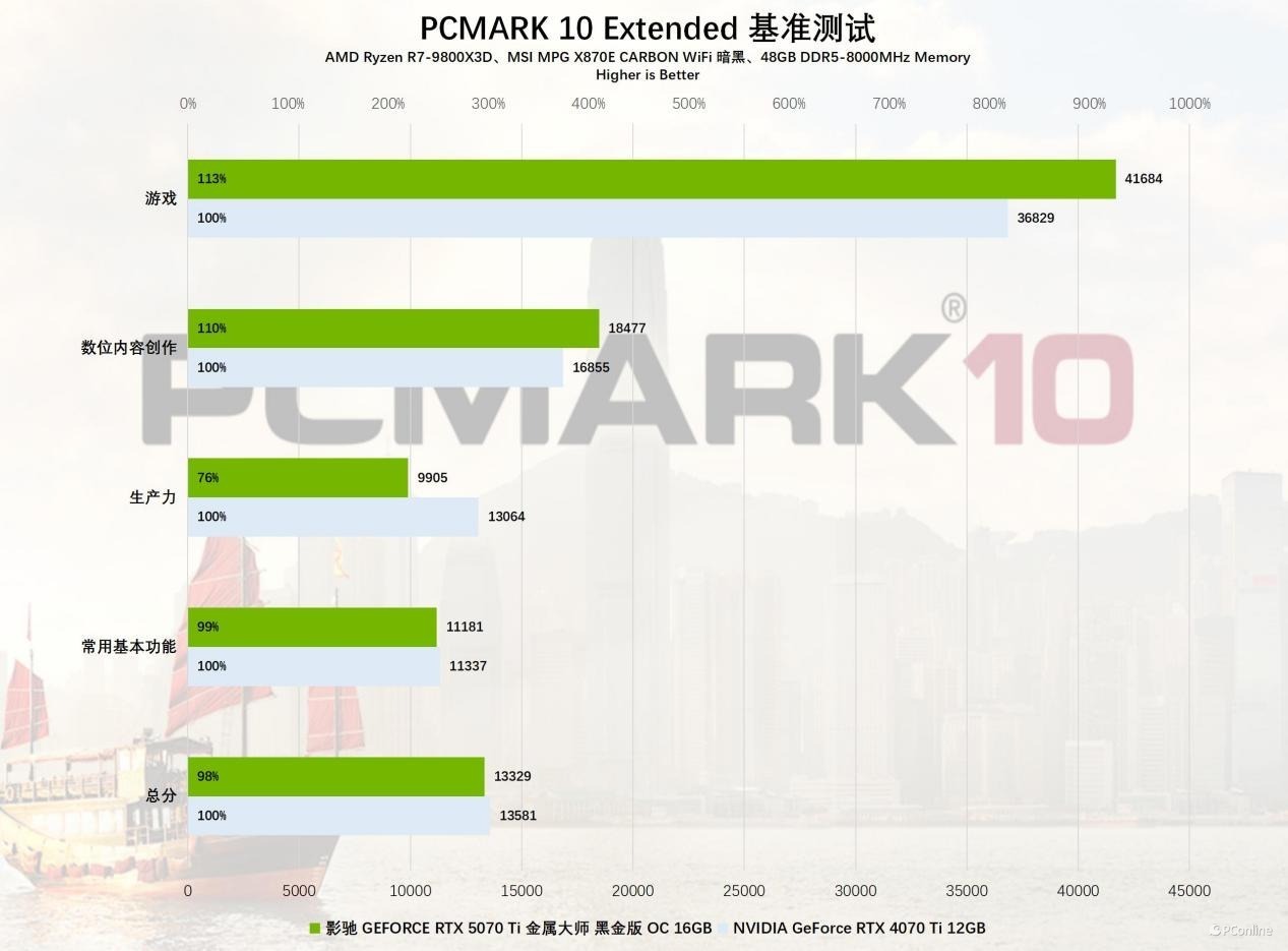 游戏测试完成后,接下来让我们关注创作者们所关心的生产力性能。在PCMark10 Extended测试中,影驰RTX 5070 Ti 金属大师OC 16GB在游戏和数字内容创作方面的表现尤为出色,相较于RTX 4070 Ti,其性能提升了大约13%和10%。然而,在生产力测试方面,其得分低于预期,这可能是因为当前驱动程序和软件优化尚未达到最佳状态。