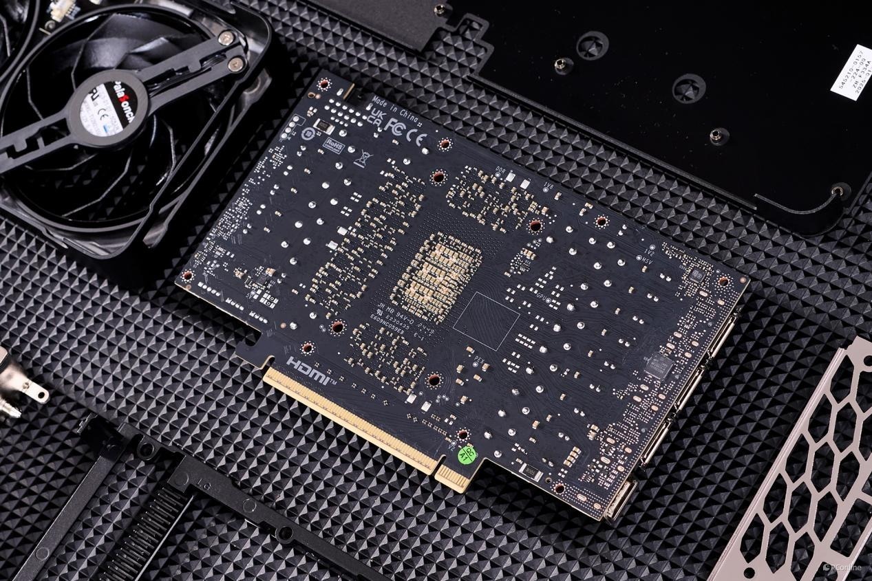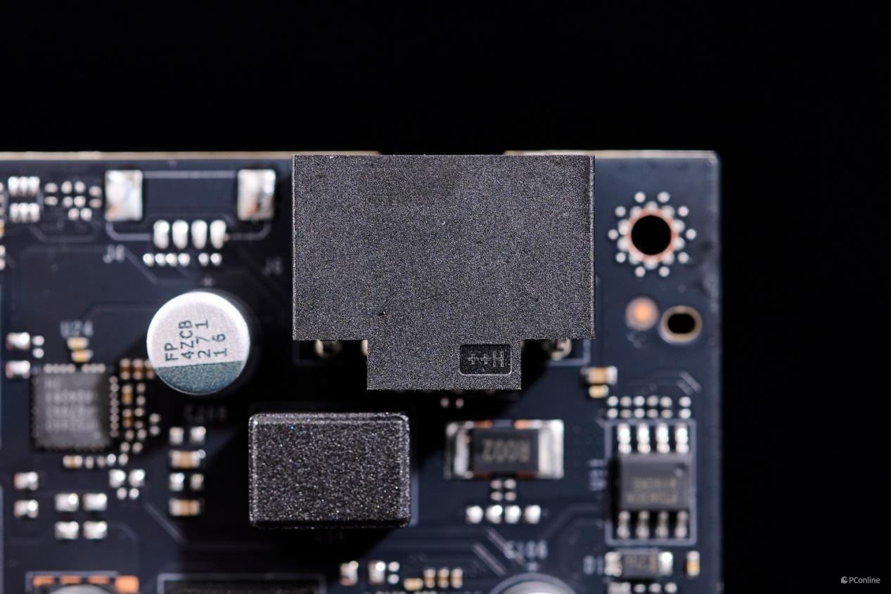 显卡的PCB背面同样布满了众多的MLCC颗粒,主供电控制器也位于这一面,因此配备金属背板显得尤为必要。