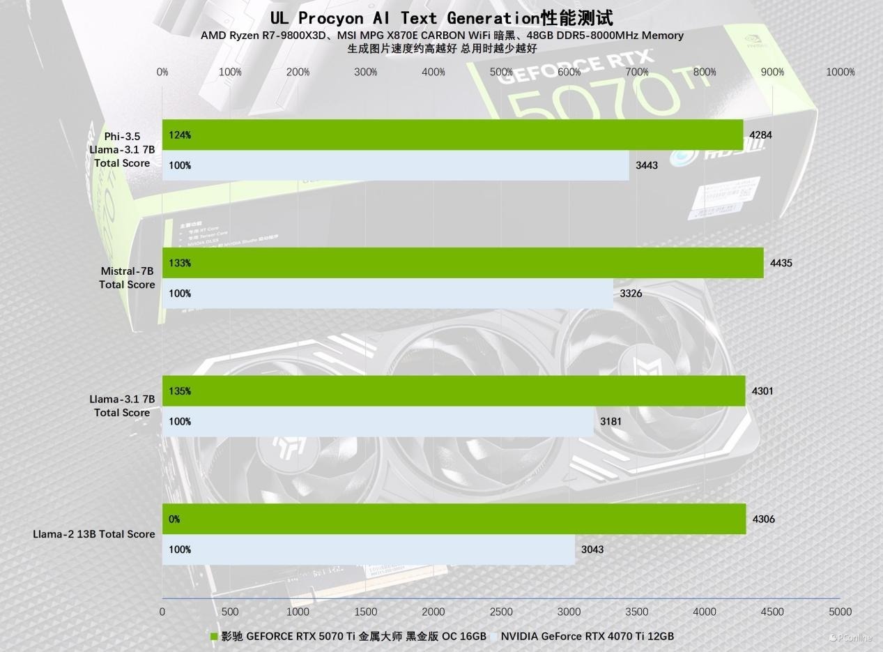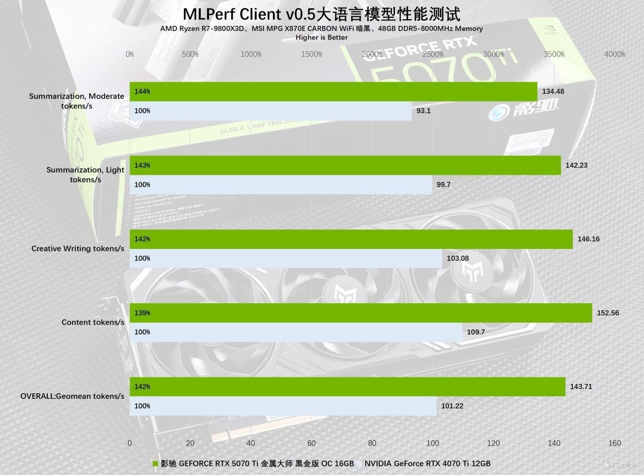 在AI文本生成测试中,我们用UL Procyon与MLPerf Client v0.5分别进行大语言模型进行测试,实测影驰RTX 5070 Ti 金属大师OC 16GB在每一项中都表现出了绝对的统治力,各项领先幅度均在40%以上。而上代RTX 4070 Ti这次终于不爆显存了,但是其性能已经被拉开了很大一段,只能说足够用,但是没RTX 5070 Ti用得爽。