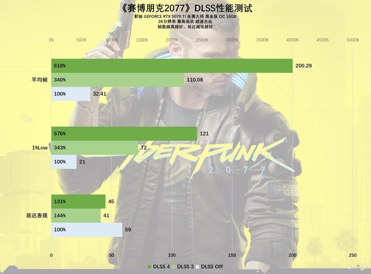 在2K分辨率、最高画质以及启用路径追踪的环境下,影驰RTX 5070 Ti 金属大师OC 16GB的帧率仅为32 FPS,这导致了游戏体验的卡顿和不快感。但是,当DLSS 3被激活后,游戏的帧数激增至110 FPS,流畅性得到了显著的提升。进一步开启DLSS 4,游戏的流畅度更是飙升至200 FPS,相较于原生分辨率,性能提升了惊人的6.2倍。更令人印象深刻的是,1%Low的帧数表现甚至超越了DLSS 3的平均帧数,这表明在整体游戏体验中几乎不存在掉帧现象,稳定性达到了极致。