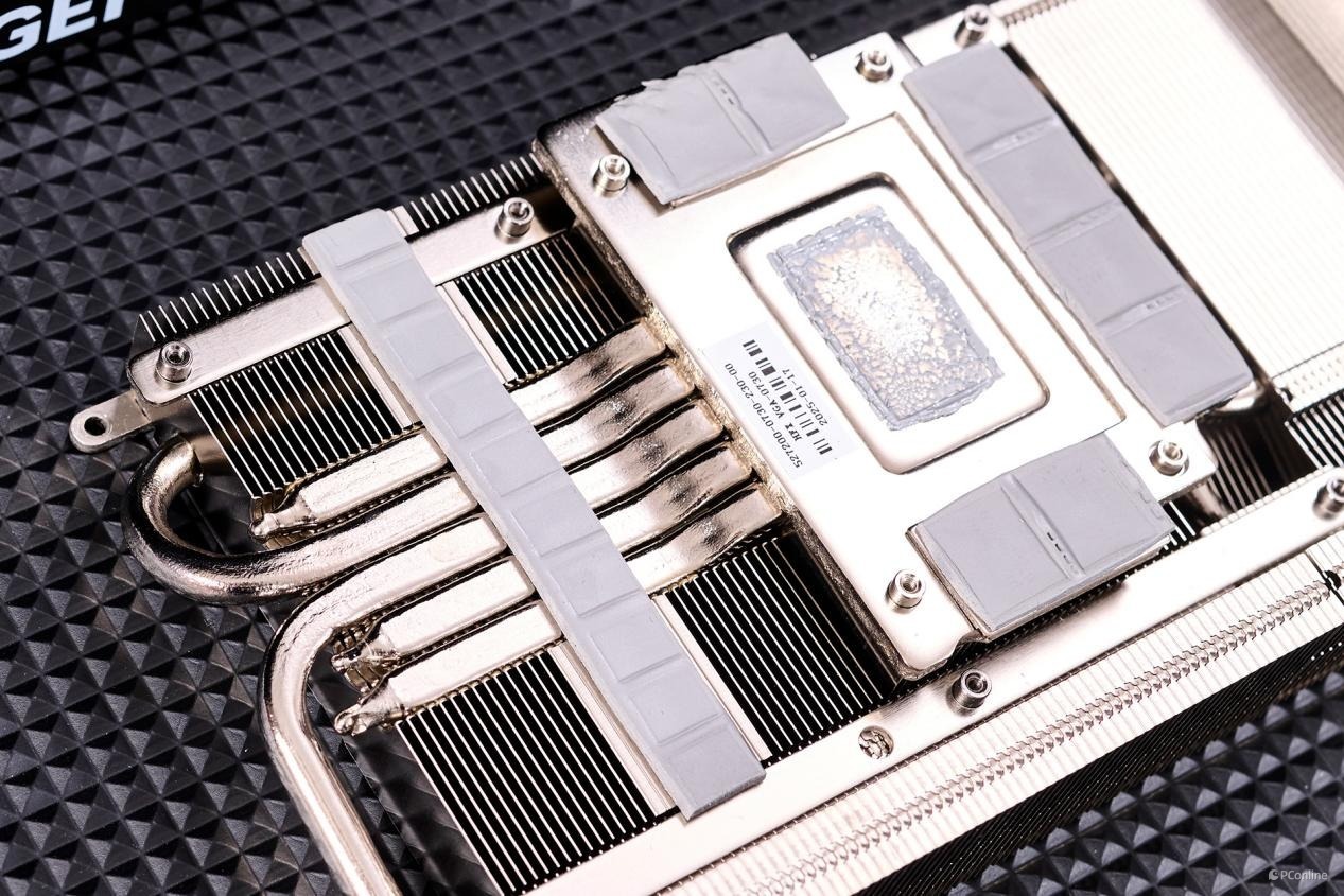 5条直径为6毫米的镀镍复合热管在被压扁后与GPU的铜底焊接,热管直接贯穿两个散热器模组,另外两条热管被添加到左侧散热片的顶部,以增强散热效果。同时,我们可以看到,热管与GPU铜底均采用了镀镍工艺处理,这不仅提升了散热器的耐腐蚀性,还有效防止了氧化。
